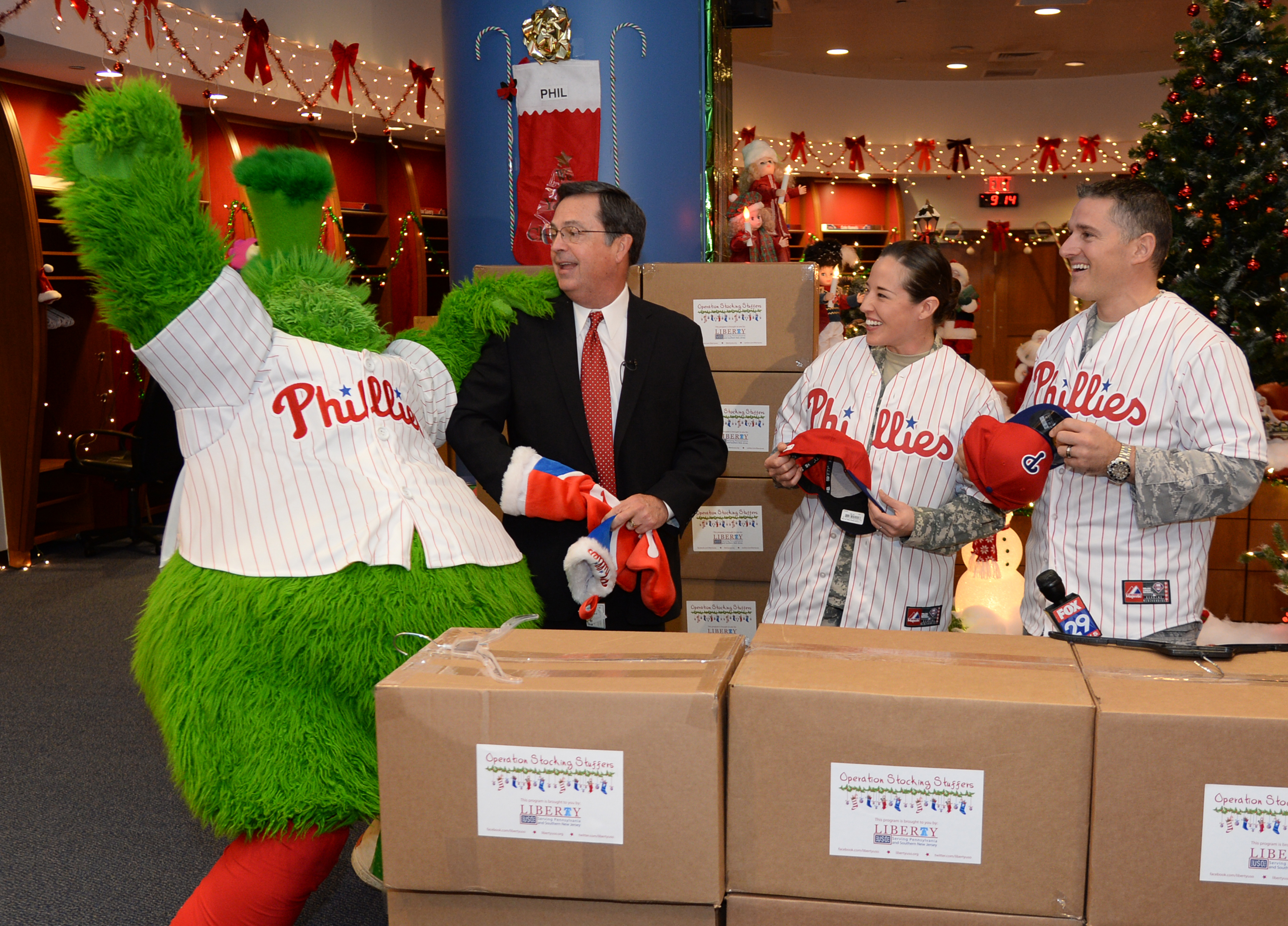 As Americans, we take pride in honoring and supporting our service men and women all year-round. The work they do is so important and we are truly thankful for them. Some of you know firsthand that being away from family and friends during the holiday season is tough, and that is especially true for members of the military. Because of this, we all can help provide comfort, care and support to the military through various ways. The Phillies took part through the Liberty USO’s Operation Stocking Stuffers.