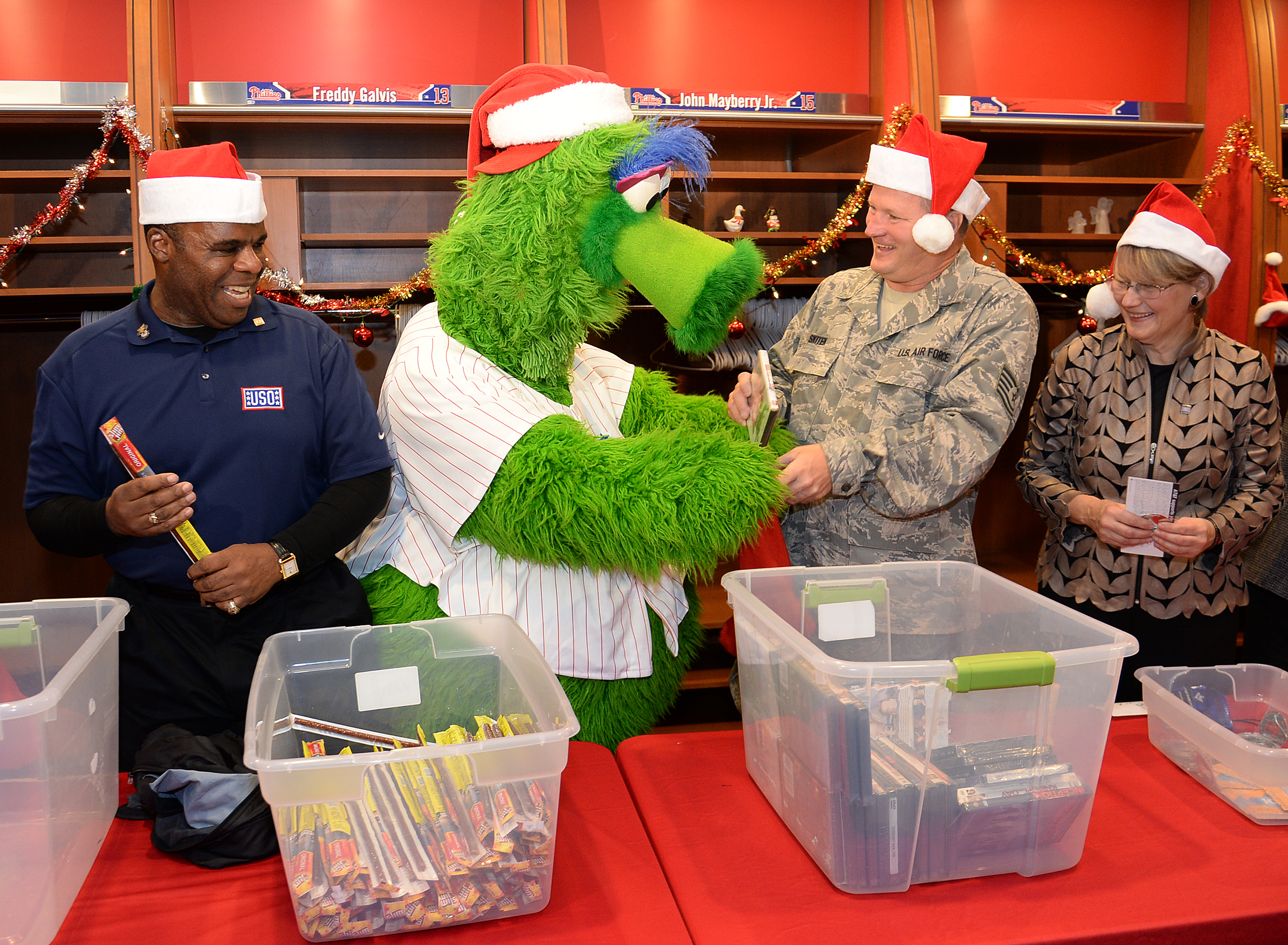 Just this past week, the Phillies and the Liberty USO held the final Operation Stocking Stuffers event in our very own clubhouse. (Santa’s workshop didn’t have anything on us!) It was a real Phanta Claus affair as the green guy, joined by Phillies Ballgirls and staff alongside USO volunteers and military members, helped stuff hundreds of stockings, which were then added to roughly 2,000 care packages being sent to military from Pennsylvania and South Jersey who are deployed in Afghanistan this holiday season. Pretty awesome. Want to know more about what the Liberty USO does and how you can help? Wish granted.