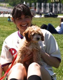 Jenna Bramble, a Phillies fan since she was three months old, learned how to sing the national anthem at the age of 10. From that point on, she has dreamed of singing it at a Phillies game and hopes to get her chance through the Phillies R U Game? Talent Search. While she doesn’t sing professionally, the former wedding singer and karaoke bar enthusiast does enjoy performing for friends and family and most of all – for fun. Jenna has performed the anthem and God Bless America at a major league ballpark before – for the Washington Nationals in 2008 – but we won’t hold that against her! (Kidding!!) She is a public relations manager for the tech start-up, Taxi Magic App, and lives with her husband, Frank, and their dog, Chase Mutley (pictured above), in Edgewater Park, NJ.