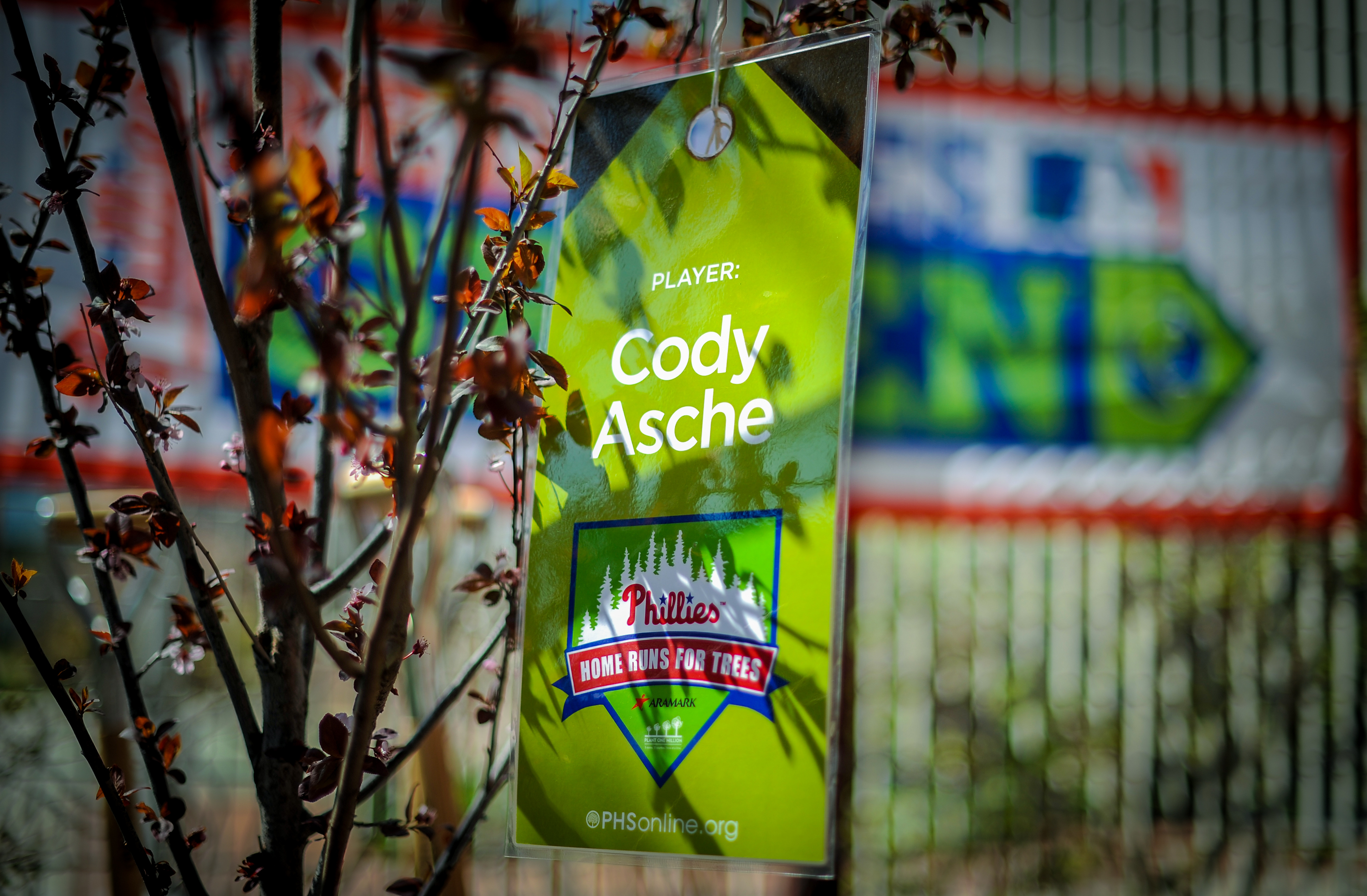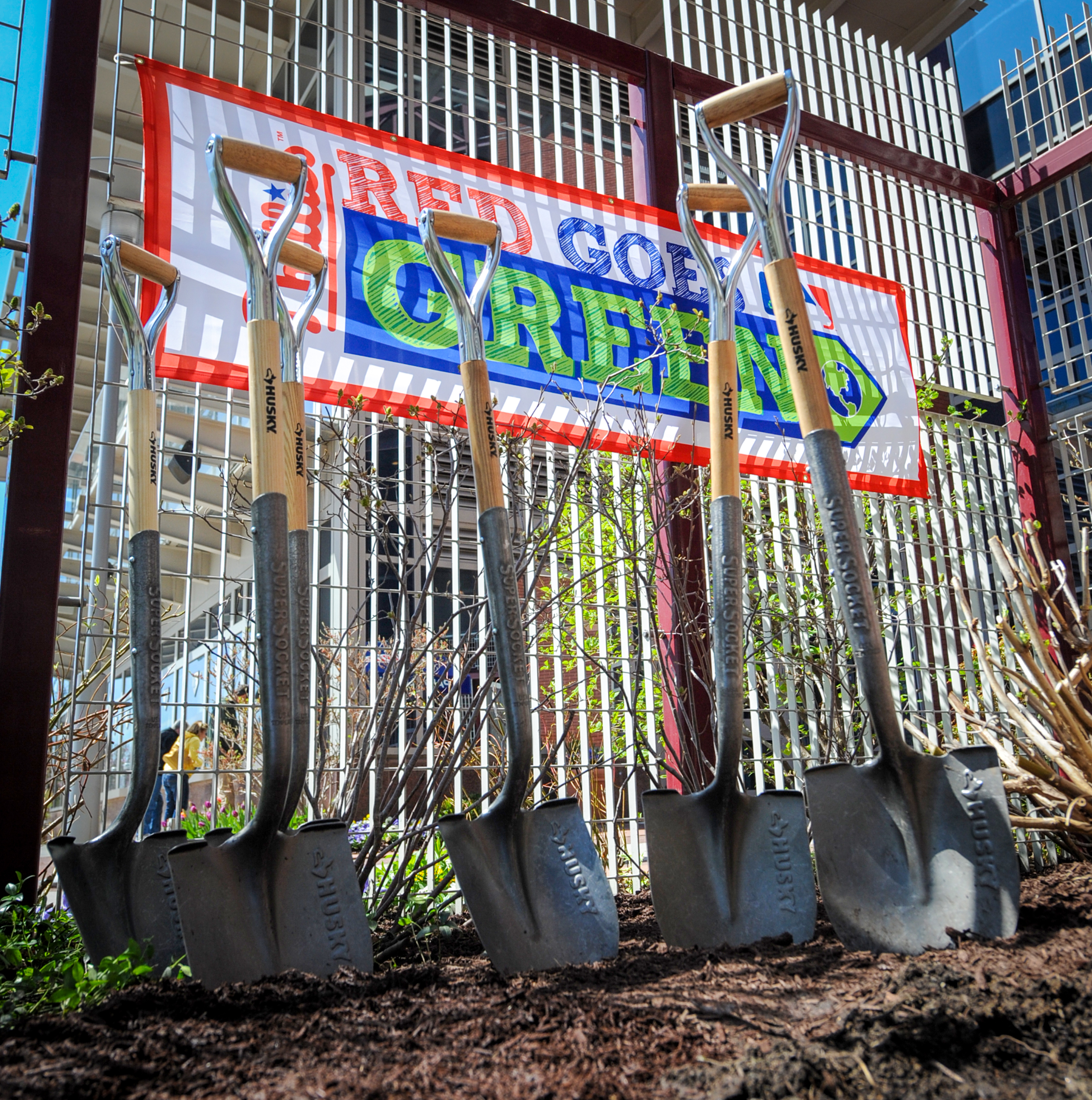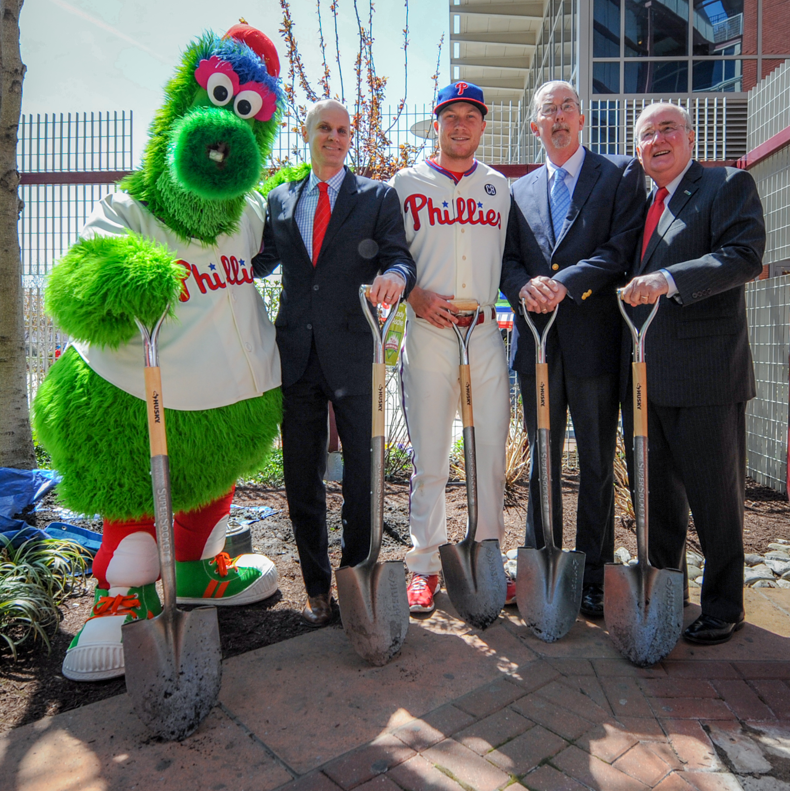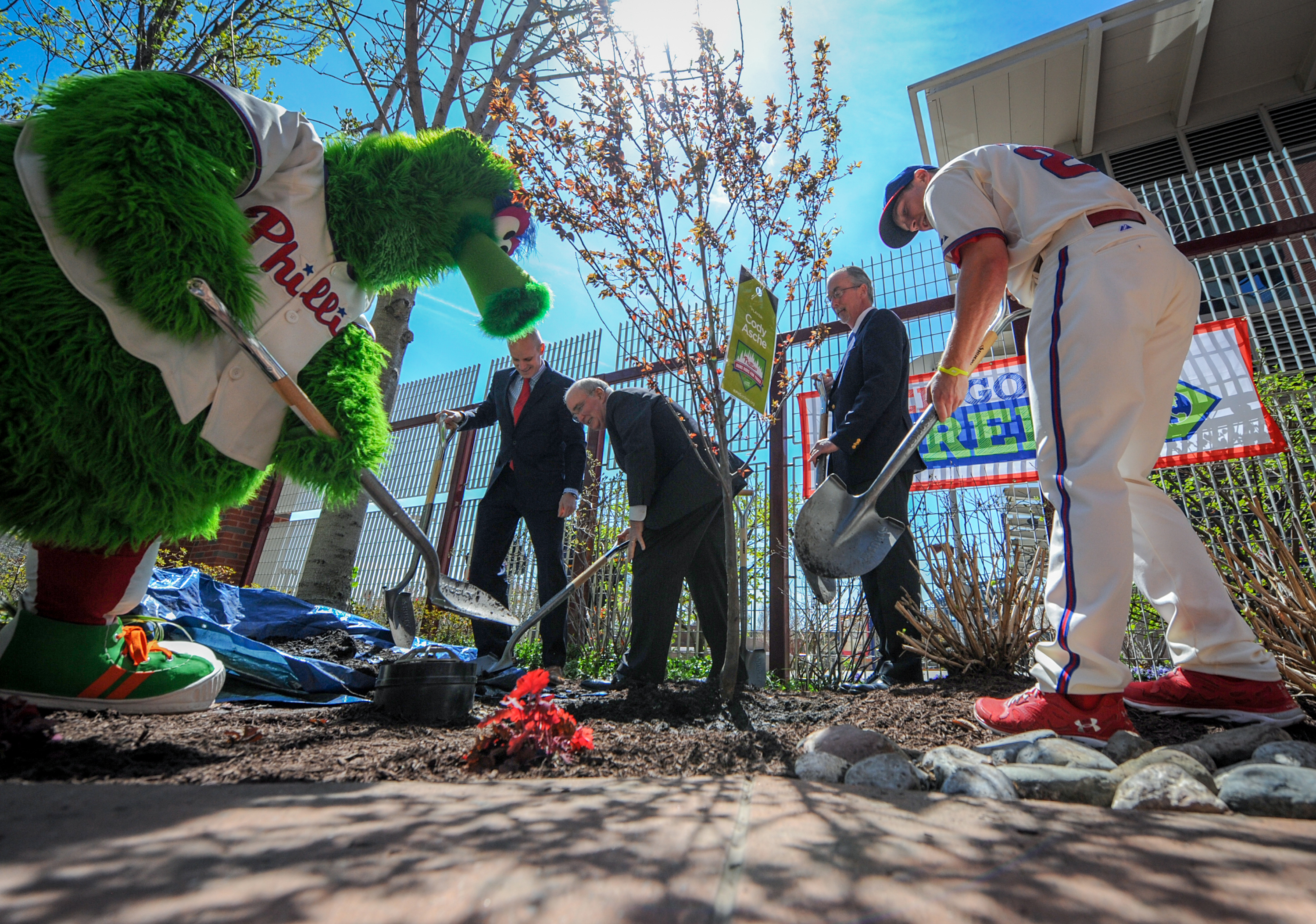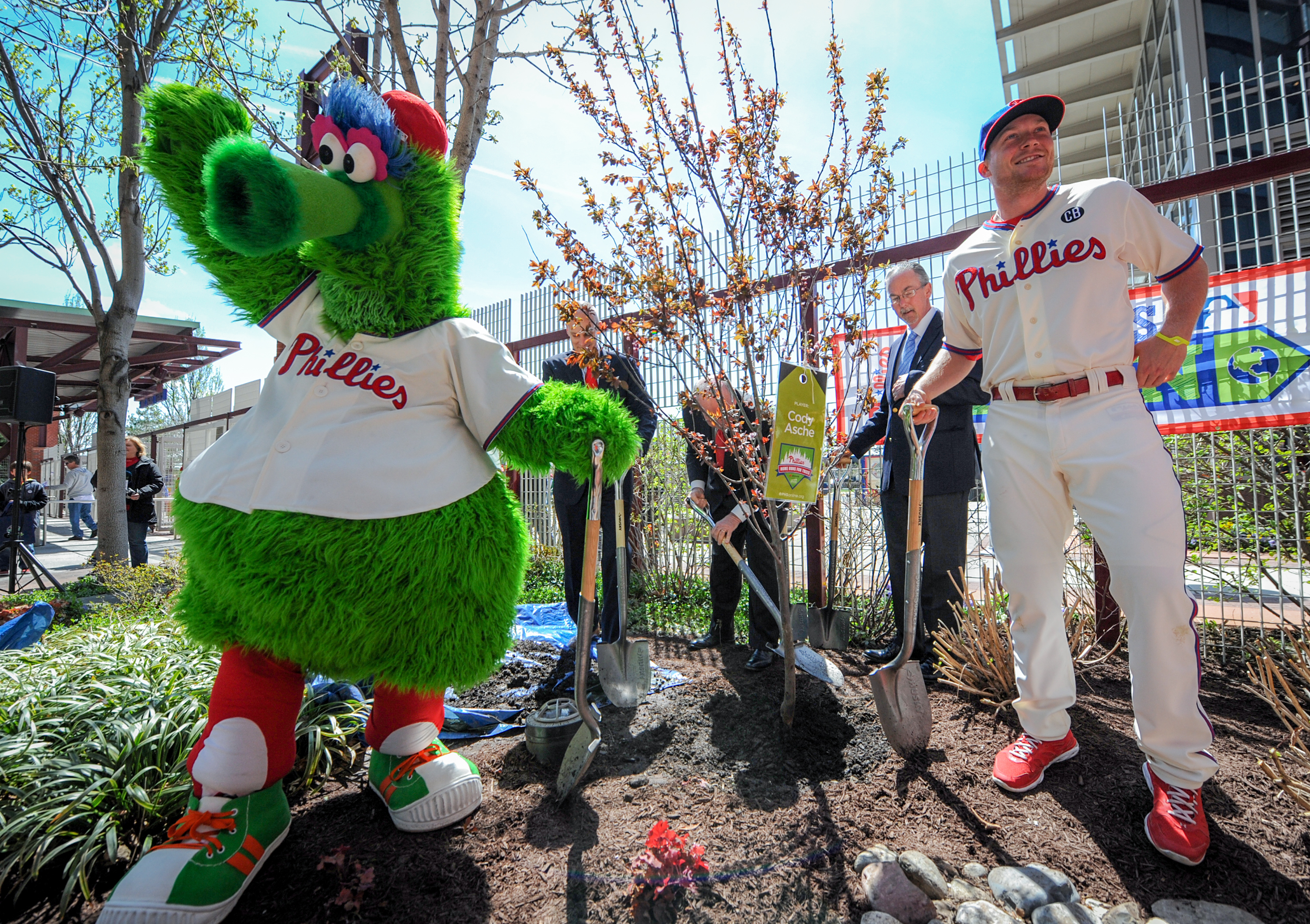 Things kicked off with Phils third baseman Cody Asche, Phillies president David Montgomery, ARAMARK’s regional director Brian Hastings, president of the Pennsylvania Horticultural Society (PHS) Drew Becher and the Phanatic who joined in to ceremonially plant a tree in Cody’s name as part of the Phillies’ Home Runs for Trees program. For each home run a Phillies player hits, a tree will be planted through the Plant One Million program with a goal of restoring the region’s tree population. The Lorax would be so proud! (We speak for the trees…too!)